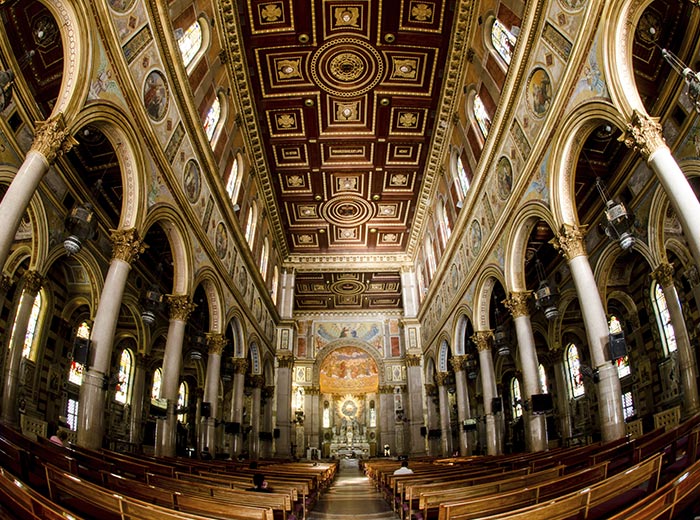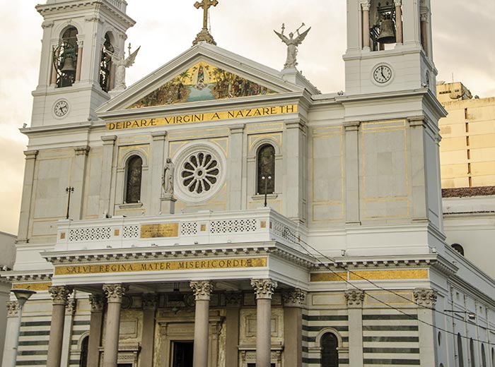 Inspirado na Igreja de São Pedro, em Roma, e projetado pelos arquitetos italianos Gino Coppedé e Giuseppe Predasso. Seus vitrais contam histórias da bíblia, enquanto os mosaicos rezam a Salve Rainha, através de anjos. Em sua construção, foi utilizado materiais de mármores de carrara, vitrais franceses, mosaicos venezianos e todos os pontos são dirigidos a um único lugar: o altar da Virgem Maria.